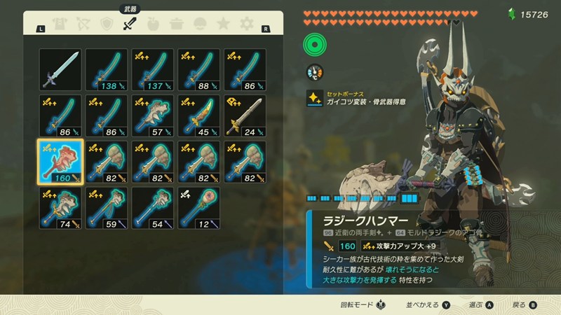 ラジークハンマー、ガイコツ変装・骨武器得意、攻撃力アップ料理、馬乗りで白銀ライネルを倒してみました。まずは準備から。。。