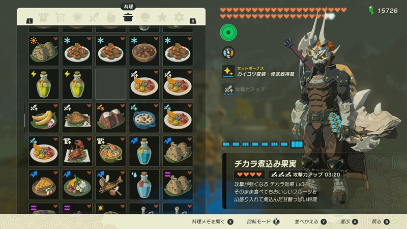 チカラ煮込み果実で攻撃力を3段階アップさせます。